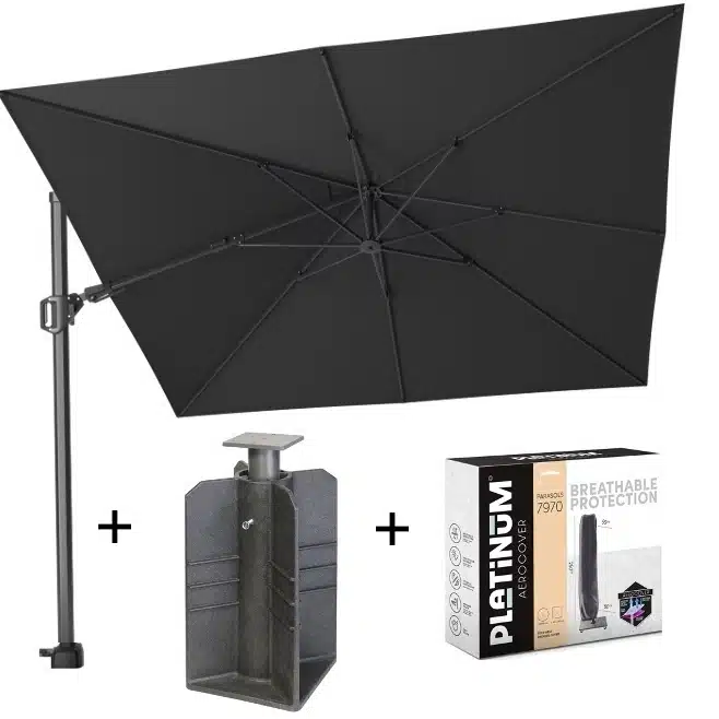 Challenger T2 300×300 cm antraciet met zwarte parasolvoet 120KG voet en hoes