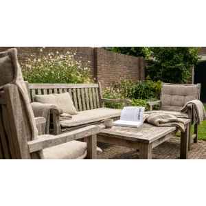 Draai kussens met het seizoen voor gelijkmatige slijtage. Reinig met milde middelen en spoel goed na. Behandel hout jaarlijks en repareer kleine beschadigingen vroegtijdig zodat ze niet verergeren. Gebruik schaduw waar mogelijk want zelfs de beste materialen vragen soms om rust