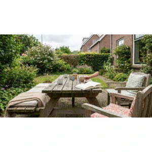 Kies materialen met een lange levensduur zoals teak met een goede behandeling, massief acacia of hoogwaardig aluminium. Deze materialen verduren weer en wind en verouderen mooi. Synthetisch gevlochten riet geeft de warme uitstraling van natuurlijk materiaal maar vraagt veel minder onderhoud. Goede kwaliteit betaalt zich terug door jaren van gebruik en minder vaak vervangen.