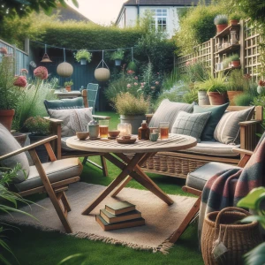 Kussens, plaids en een buitenkleed maken je loungeset direct uitnodigender. Speel met kleuren en texturen om warmte te brengen naast het groen van de planten. Kies waterafstotende stoffen of bewaar kussens in een opbergbox bij slecht weer. Een groot buitenkleed trekt alles samen en geeft een knus gevoel alsof je binnen zit