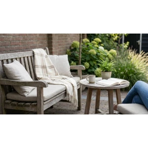 Zorg voor één of twee vaste zitplekken waar je echt kunt blijven hangen een bank bij daglicht en een zithoek met zachte verlichting voor de avond. Voeg slim comfort toe met een paar kussens in neutrale tinten en een outdoorkleed dat makkelijk schoon te maken is. Kies meubels die uitnodigen om te lezen te eten of simpelweg te zitten en te luisteren naar de wind.