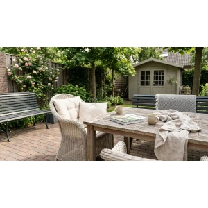 Donkere meubels stralen sfeer en elegantie uit, ze voelen robuust en aards. Zwart antraciet en diepe houttinten zetten een krachtig contrast tegen groen en bloemen en creรซren een knusse plek voor avondgezelschap. Donkere materialen verbergen kleine gebruikssporen en blijven langer fris ogen tussen de schoonmaakbeurten door. Op koelere dagen absorberen ze wat warmte van de zon waardoor je nog net iets langer buiten kunt blijven genieten wanneer het afkoelt.