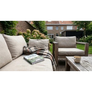 Kies een stevig frame van aluminium of teak als je duurzaamheid belangrijk vindt. Aluminium is licht en onderhoudsarm, teak wordt mooier met de jaren. Belangrijk zijn de kussens met sneldrogend schuim en waterafstotende hoezen, die zorgen dat je niet met sponsachtige zitkussens blijft zitten na een regenbui. Let ook op UV bestendigheid zodat kleuren lang mooi blijven
