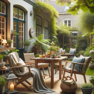 Tuinstijl en meubelen dragen bij aan sfeer, maar vorm nooit alles rond รฉรฉn object. Een simpel houten tafel en comfortabele stoelen kunnen een plek uitnodigend maken, kussens en plaids voegen warmte toe, en een enkele bank of hangstoel nodigt uit om te blijven. Verlichting en een waterornament versterken de beleving in de avond en geven diepte aan het ontwerp.