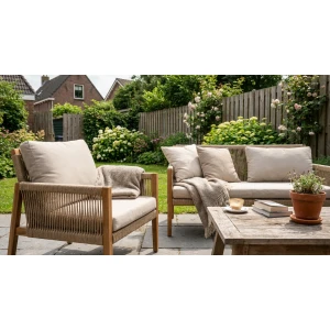 Kies één hoekje in de tuin en richt het in als vaste ontmoetingsplek. Een comfortabele rope bank of een set losse rope stoelen met een lage tafel nodigen uit om samen te zitten, te praten of een boek te lezen. Leg een paar weerbestendige kussens neer in warme kleuren en voeg een plaid toe voor koelere avonden. Zo ontstaat een plek die meteen vertrouwd voelt