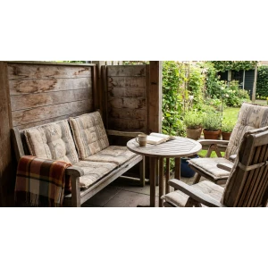 Zorg dat de indeling warmtevaste plekken creรซert. Zet zitplekken bij windschermen en gebruik dikke buitenkleden en plaids om de voeten warm te houden. Texturen en lagen houden de warmte vast en maken het direct knusser. Denk ook aan reflecterende schermen achter een warmtebron om de straling naar de zitplek te richten