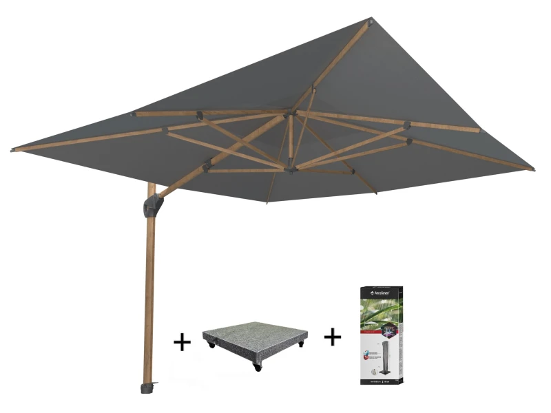 Hacienda zweefparasol 300×400 cm houtlook frame charcoal 125KG voet en hoes