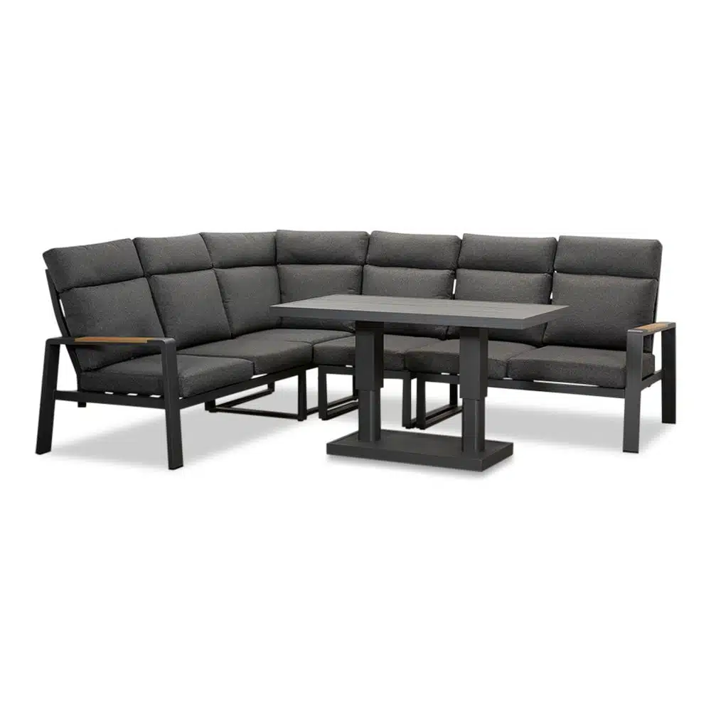 De tafel heeft een slimme verstelbare functie die zich probleemloos aanpast van dineren naar loungen. Zet de tafel hoger voor een uitgebreid diner of laat deze zakken voor een ontspannen borrel met vrienden. Deze flexibiliteit maakt de set geschikt voor verschillende gelegenheden en wisselende behoeftes.