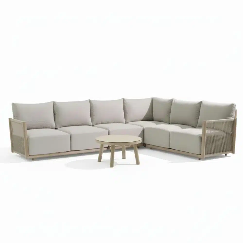 2 beoordelingen voor Beau hoek loungeset 6 personen incl. tafel 70cm rond | aluminium + touw | grijs | 5-delig – 304x234cm