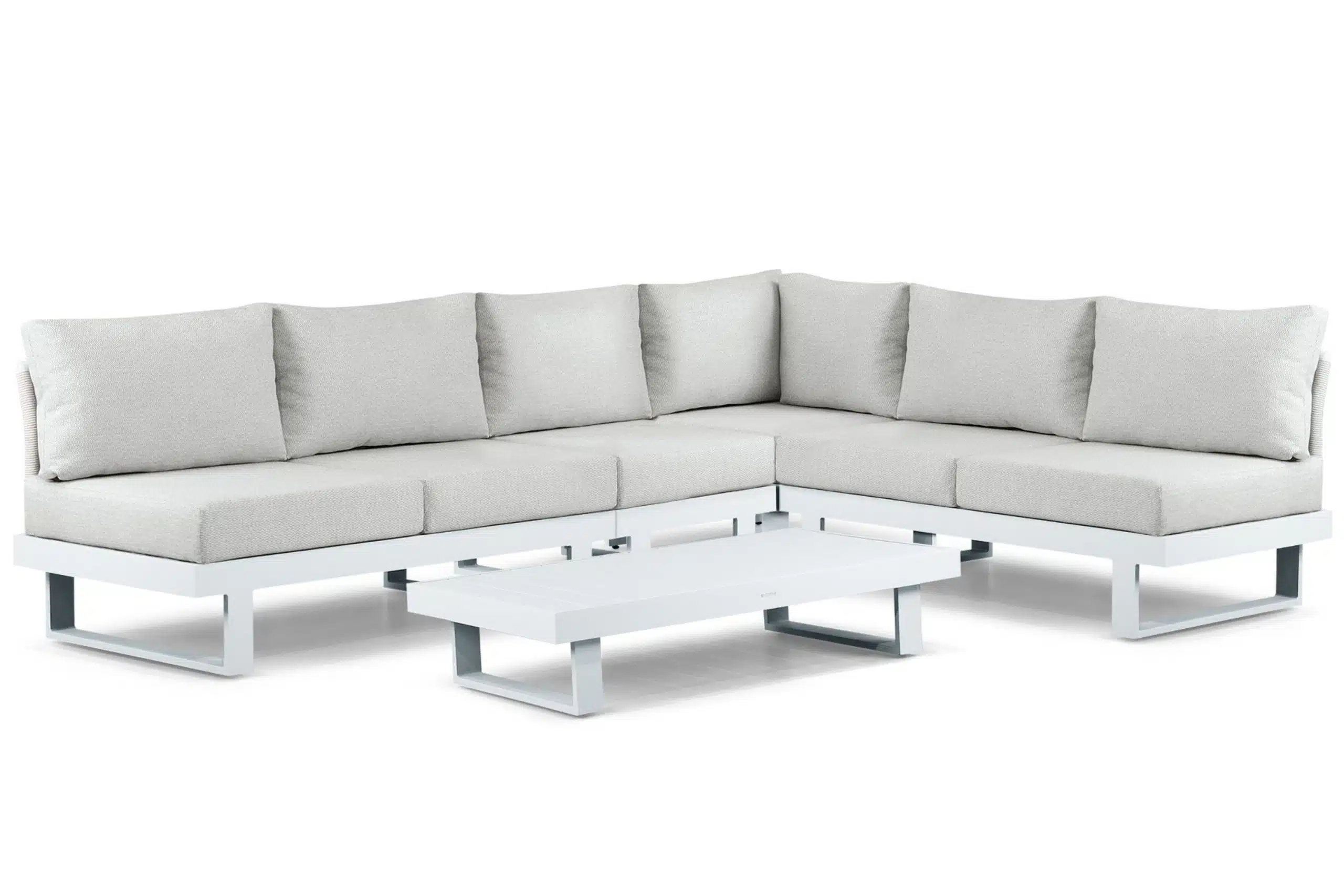 Beleef de essentie van de zomer met de Lifestyle Lorenzo hoek loungeset 5-delig. Deze prachtige loungeset, uitgevoerd in een frisse witte tint, straalt een ongeรซvenaarde sfeer van relaxatie en elegantie uit. Het royale hoekdesign is perfect voor lange avonden met vrienden en familie, waarbij u samen kunt genieten van de zonsondergang of een gezellige brunch op uw terras.
