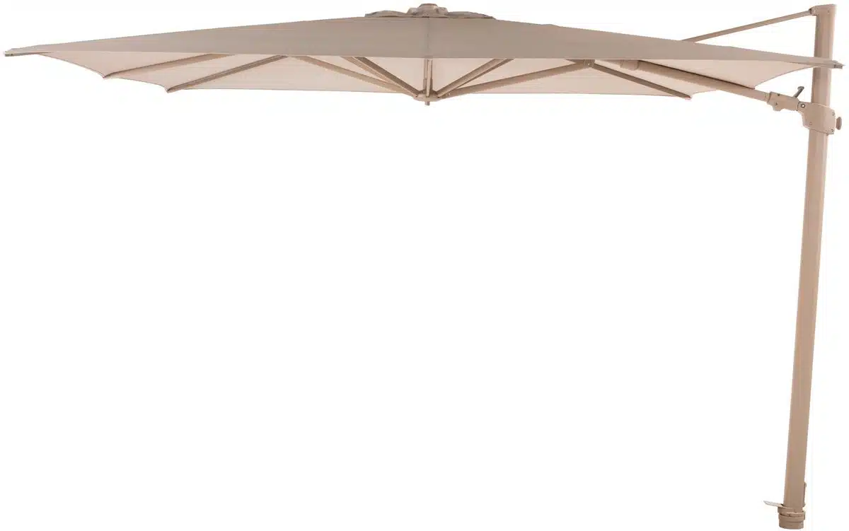 De 4-Seasons zweefparasol Siesta Premium 300 x 300 cm in de latte zand kleur brengt schaduw en stijl naar elk terras. Dit model combineert een royaal doekoppervlak met een slanke constructie zodat tuin en buitenruimte er verzorgder uitzien. De zachte kleur past bij veel buitenstijlen en geeft een rustige uitstraling.