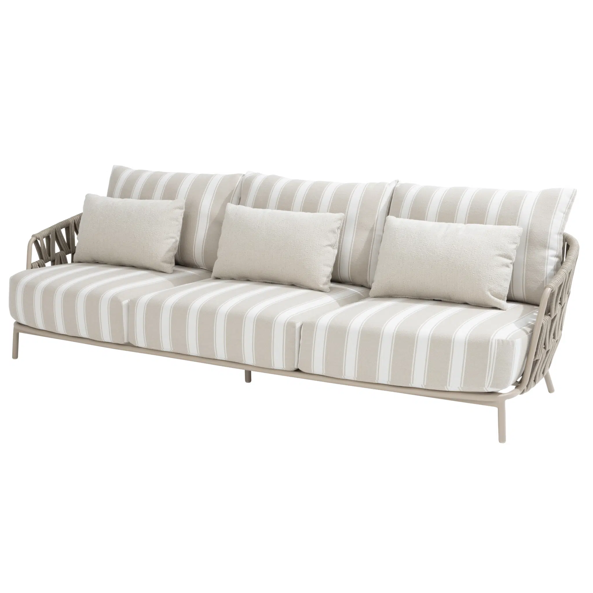 Beverly lounge 3 zitsbank van 4 Seasons Outdoor brengt een serene en moderne sfeer naar uw buitenruimte. Deze ruime loungebank is speciaal ontworpen voor optimaal comfort en voor een lange gebruiksduur. De warme zand latte kleur geeft een natuurlijke uitstraling die makkelijk te combineren is met bestaande tuinmeubelen en accessoires. Het frame is gemaakt van lichtgewicht aluminium waardoor verplaatsen eenvoudig is en het meubel minder belastend voor de ondergrond.