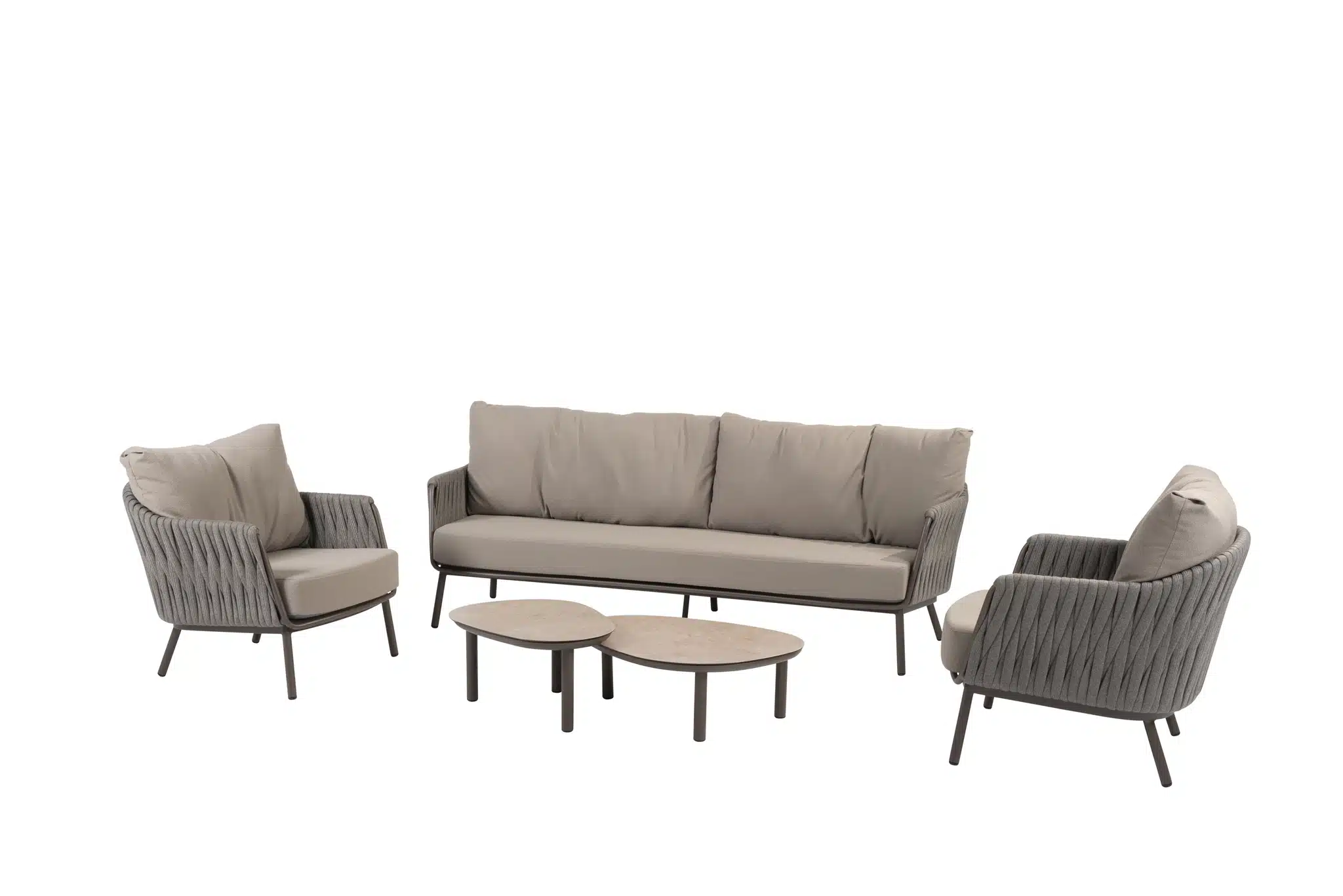 De Cannes loungeset met Monroe koffietafels van 4 Seasons Outdoor is ontworpen voor buitenleven met klasse en gebruiksgemak. Deze complete zitgroep vormt een uitnodigende plek om te ontspannen en gasten te ontvangen.