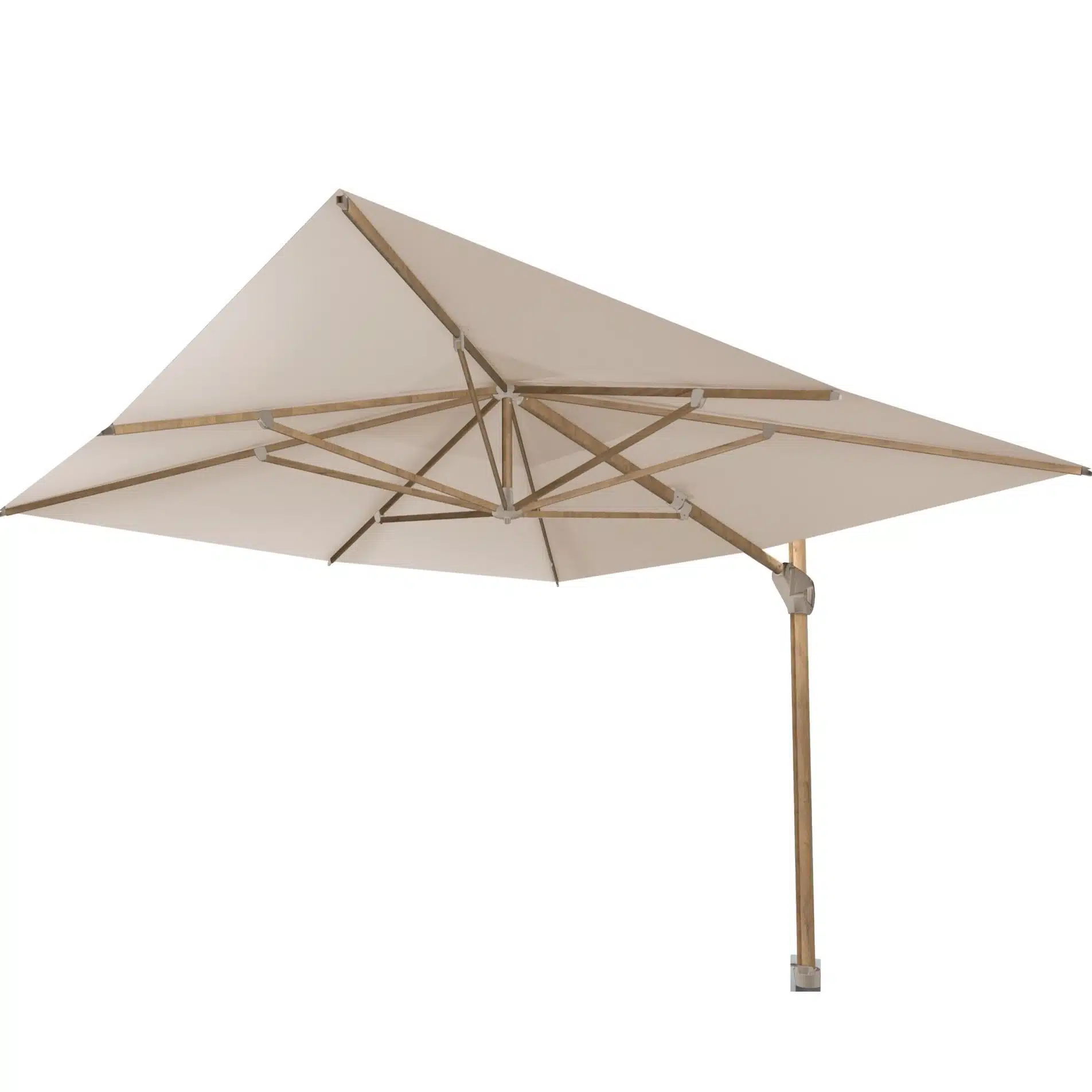 De Hacienda Premium zweefparasol van 4 Seasons Outdoor met houtlook frame en rechthoek zand Solefin parasoldoek is een topklasse parasol die niet alleen zorgt voor schaduw, maar ook een luxe uitstraling biedt aan je buitenruimte.