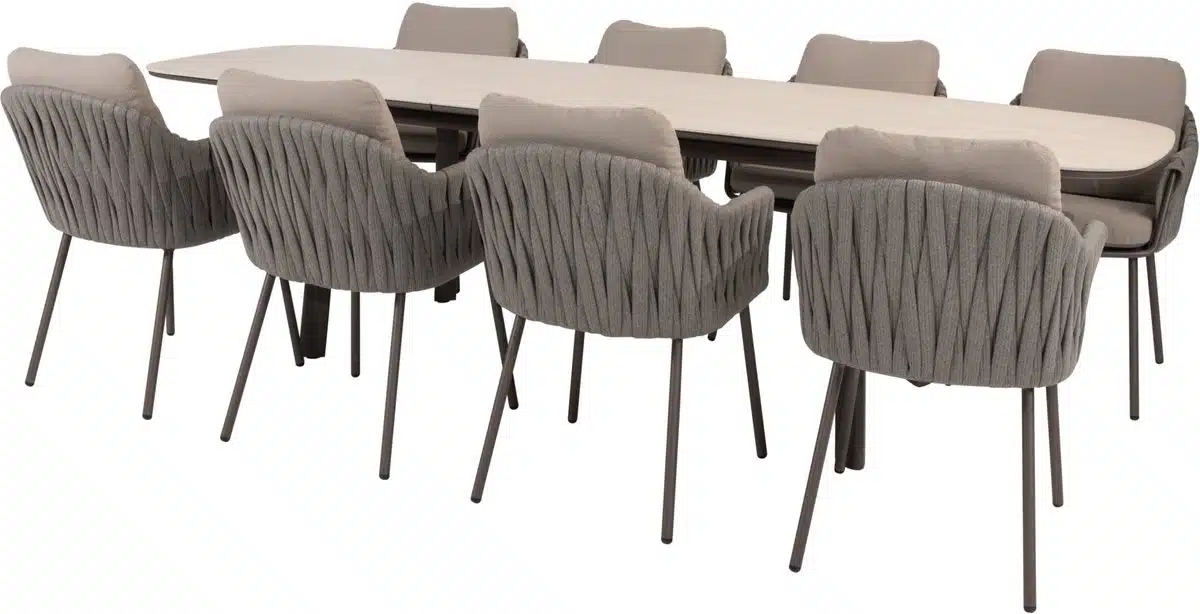 Stijlvolle en robuuste tuinset met een uitschuifbare keramische tafel – eenvoudig te verlengen en ideaal voor lange etentjes. De 9-delige set zit comfortabel, vergt weinig onderhoud en geeft de tuin direct een verzorgde uitstraling.
