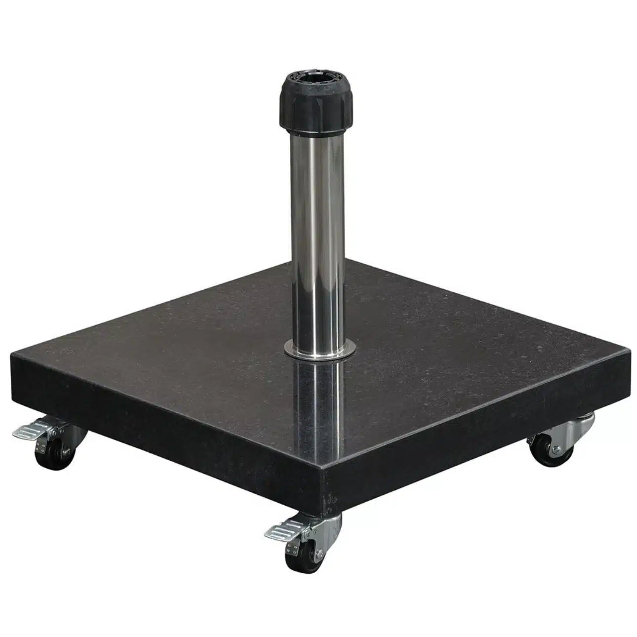 De parasolvoet is van graniet. De parasolvoet heeft wieltjes waardoor deze zéér eenvoudig te verplaatsen is. De RVS buis geeft de parasolvoet een luxe uitstraling. Het antislip systeem zorgt dat de parasol niet gaat tollen in de wind. De parasolvoet is geschikt voor parasol tot een doorsnede van 400 cm.