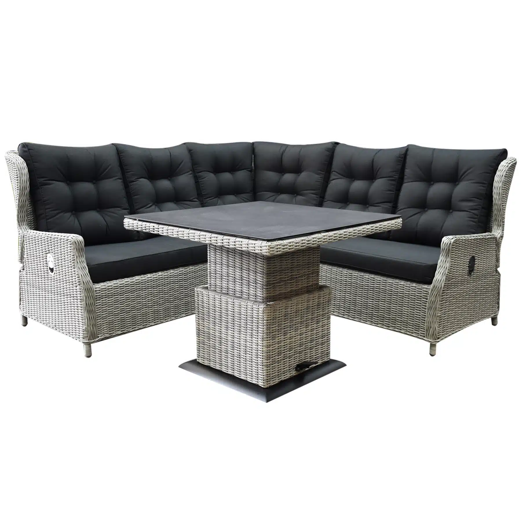 De verstelbare vierkante tafel is een echt pronkstuk en vormt de ideale setting voor diners onder een sterrenhemel of een relaxte brunch met vrienden op een zonnige middag. Het moderne ontwerp van de loungeset, in combinatie met de comfortabele kussens, nodigt uit tot langdurig loungen en genieten van het buitenleven. Of je nu een boek leest, gezellig keuvelt met vrienden of gewoon wilt ontspannen, deze set zorgt voor een perfecte ambiance.