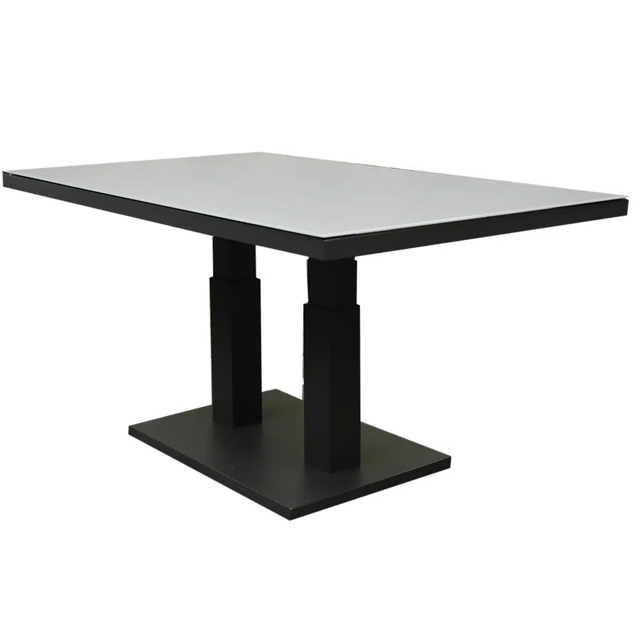 De robuuste constructie van antracietkleurig aluminium zorgt niet alleen voor een moderne uitstraling, maar garandeert ook dat de tafel jarenlang meegaat. De glazen tafelblad voegt een vleugje elegantie toe en maakt het geheel compleet. Dankzij de unieke hoogteverstelling kun je de tafel eenvoudig aanpassen van 49 naar 72 cm. Dit betekent dat je voor elk moment de juiste hoogte kunt kiezen, of je nu een uitgebreid diner organiseert of juist comfortabel wilt loungen met een drankje in de hand.