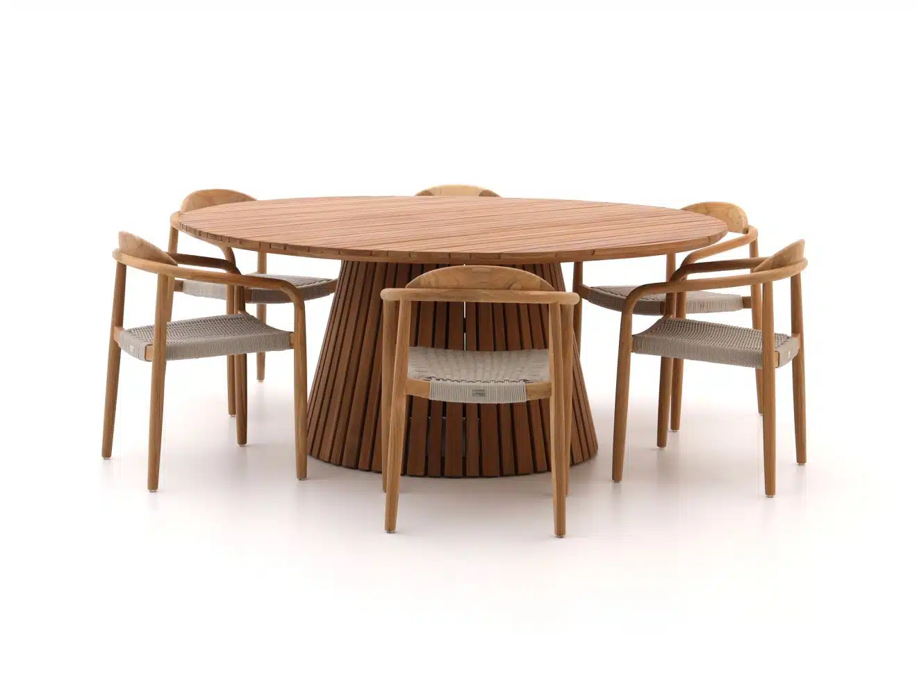 De Bellagio Berbaro Santa Severina dining set is een stijlvolle en praktische keuze voor buiten. Deze 7 delige set bestaat uit een royale tafel van 180 cm en zeven comfortabele stoelen die zich uitstekend lenen voor lange diners en gezellige bijeenkomsten. Het warme bruine kleurenschema van de materialen geeft een natuurlijke uitstraling en past moeiteloos bij zowel moderne als klassieke tuinen. Dankzij het slimme ontwerp zijn de stoelen stapelbaar zodat de set compact kan worden opgeborgen in voorjaar en najaar.