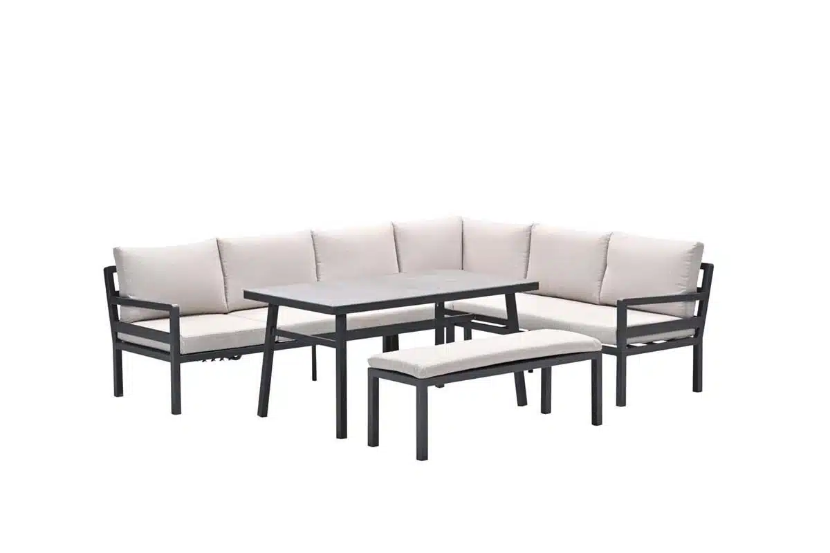 De Corsica lounge-diningset in een 4-delig model met een rechteropstelling brengt een moderne uitstraling naar elk terras, balkon of stukje tuin. De combinatie van carbon black frames en desert sand kussens geeft een stijlvolle, tijdloze sfeer die goed combineert met verschillende buiteninrichtingen. Het neutrale grijs in de accenten zorgt voor een subtiel contrast dat rust uitstraalt.