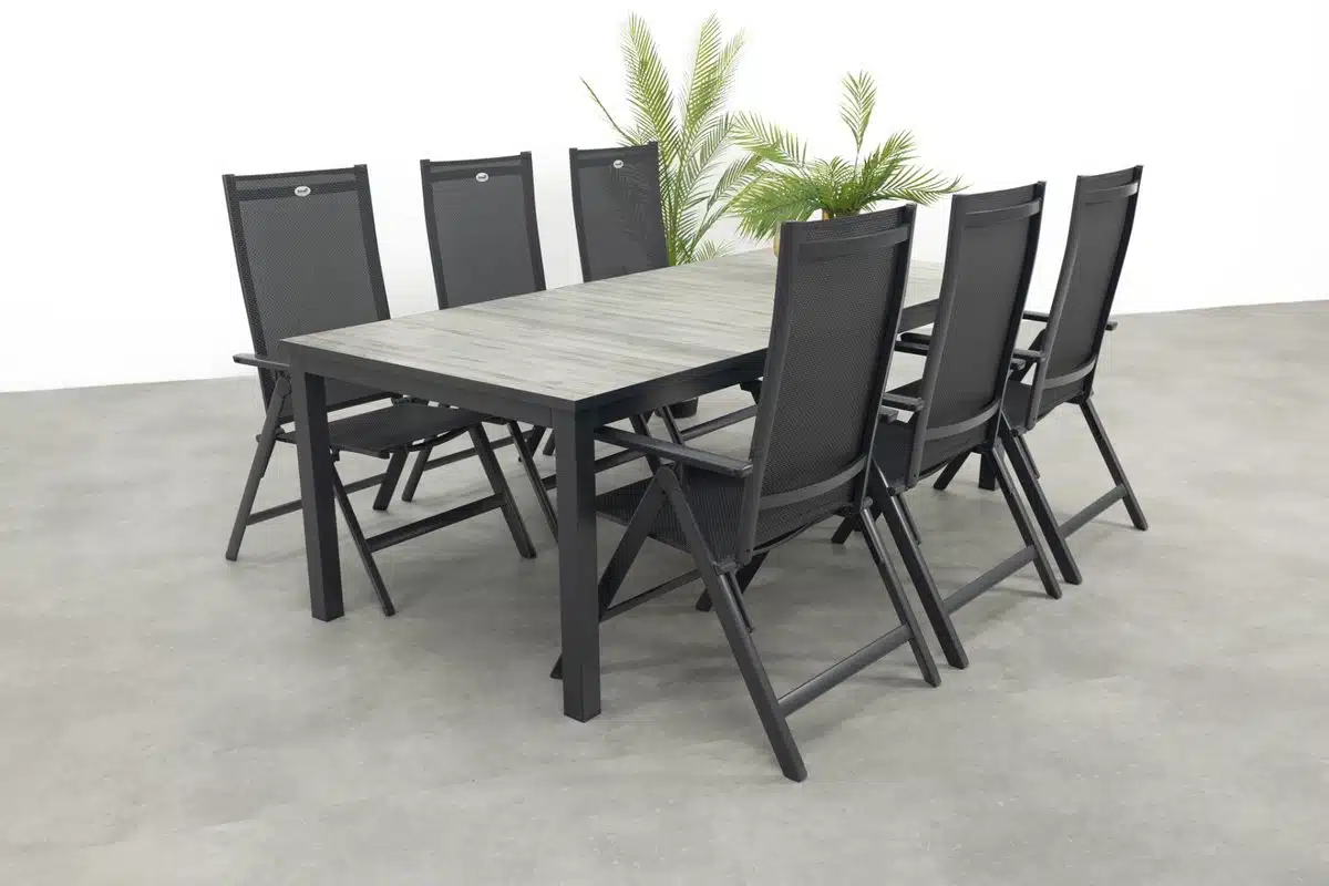 Ontdek de Napoli Comino verstelbare tuinset 7 delig 223 x 105 cm van een vertrouwd topmerk. Deze complete set combineert moderne vormgeving met comfort en gebruiksgemak. De stijlvolle antraciet en zwarte uitvoering geeft een eigentijdse uitstraling die moeiteloos past bij iedere buitenruimte. De ruime tafel biedt plaats aan zes personen en is groot genoeg voor uitgebreide diners, koffiemomenten en spelletjes met vrienden.