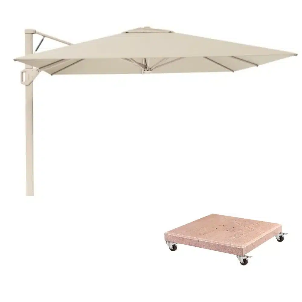 De parasol rust op een massieve Venezia parasolvoet met een gewicht van 120 kg, wat zorgt voor uitstekende stabiliteit, zelfs bij lichte wind. Het slimme bevestigingssysteem maakt het eenvoudig om de parasol veilig vast te zetten en later weer te verwijderen. Zo wissel je moeiteloos tussen beschutting en een open terras.