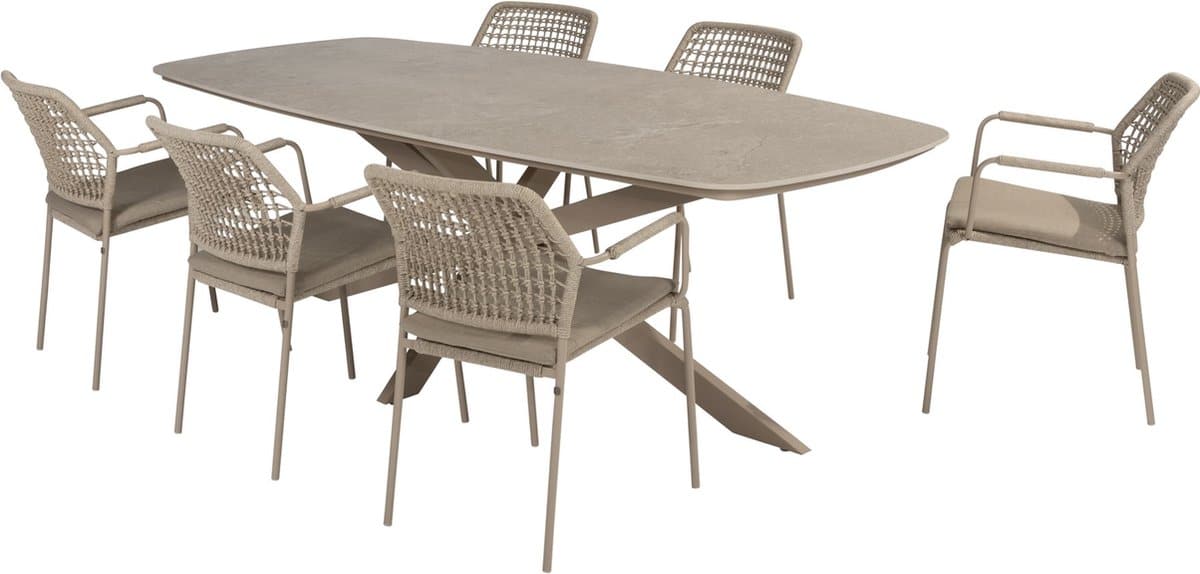 De Barista Prado dining tuinset 240x105xH75 cm 7 delig latte is stijlvol en degelijk. Ruime tafel, comfortabele stoelen en een luxe uitstraling, perfect voor gezellige diners buiten.