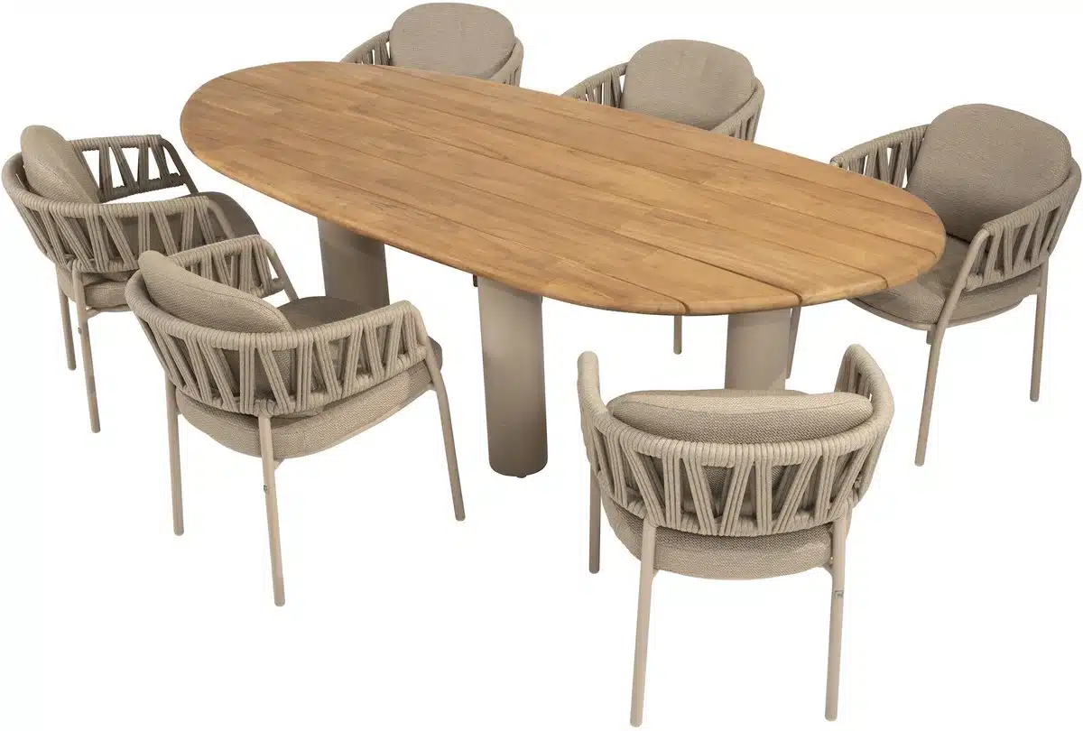Het frame is vervaardigd voor weerbestendigheid en stabiliteit zodat de tafel stevig blijft bij dagelijks gebruik. Teak details dragen bij aan de robuuste uitstraling en vergrijzen op natuurlijke wijze zonder in te boeten aan karakter. Dankzij onderhoudsarme materialen blijft de set makkelijk schoon te houden en klaar voor gebruik na een korte reiniging.