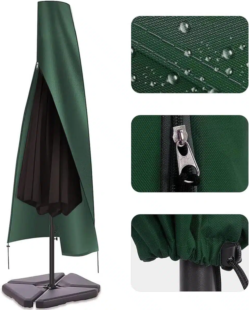 Bescherm je parasol effectief met deze stevige groene hoes. De hoes is vervaardigd van duurzame 600D Oxford-stof met een waterdichte PVC coating, waardoor regen en vuil geen kans krijgen. De beschermlaag vermindert ook UV schade, zodat het doek en mechaniek van de parasol langer goed blijven.