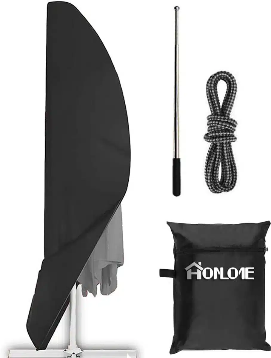 Deze waterdichte parasolhoes is speciaal gemaakt voor 9-10ft offset parasols met een lengte van 270-300cm. Het eenvoudige, merkloze ontwerp in zwart past bij elke tuin en terras stijl. Dankzij de ruime maatvoering blijft de hoes goed zitten zonder te klemmen of te veel ruimte in te nemen.