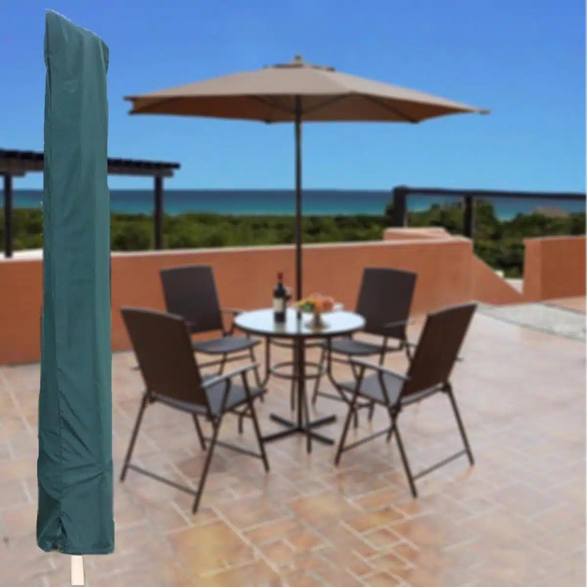 Plaatsing gaat snel en zonder gereedschap. Trek de hoes over de geopende of ingeklapte parasol en sluit het trekkoord om te voorkomen dat de hoes wegwaait. Voor extra levensduur is het advies om de hoes droog op te bergen wanneer de parasol langdurig binnen wordt opgeslagen. De combinatie van gebruiksgemak, bescherming en een neutrale groene kleur maakt dit een praktische keuze voor wie zorgeloos van de tuin wil genieten.