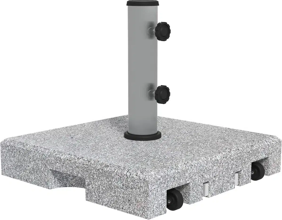 De constructie is robuust en stabiel, waardoor de parasol stevig blijft staan bij normaal gebruik. Zwenkwielen maken het eenvoudig om de parasol van plek te veranderen, zonder te hoeven tillen of te slepen. Wanneer u de parasol op zijn plaats wilt houden zijn de remmechanismen aan de wielen snel te activeren. Dit geeft extra veiligheid bij lichte wind of wanneer de parasol tijdelijk vastgezet moet worden.