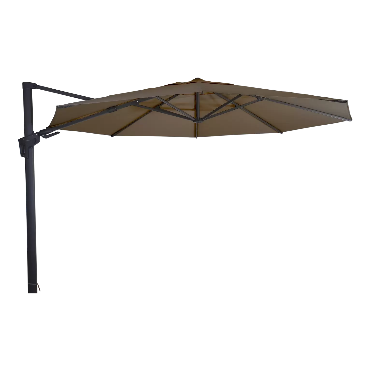 Grote Zweefparasol VirgoFlex Taupe 3,5m van Lesli Living. Een grote luxe inklapbare parasol zonder parasolvoet en zonder parasolhoes voor schaduw op het balkon of in de tuin.