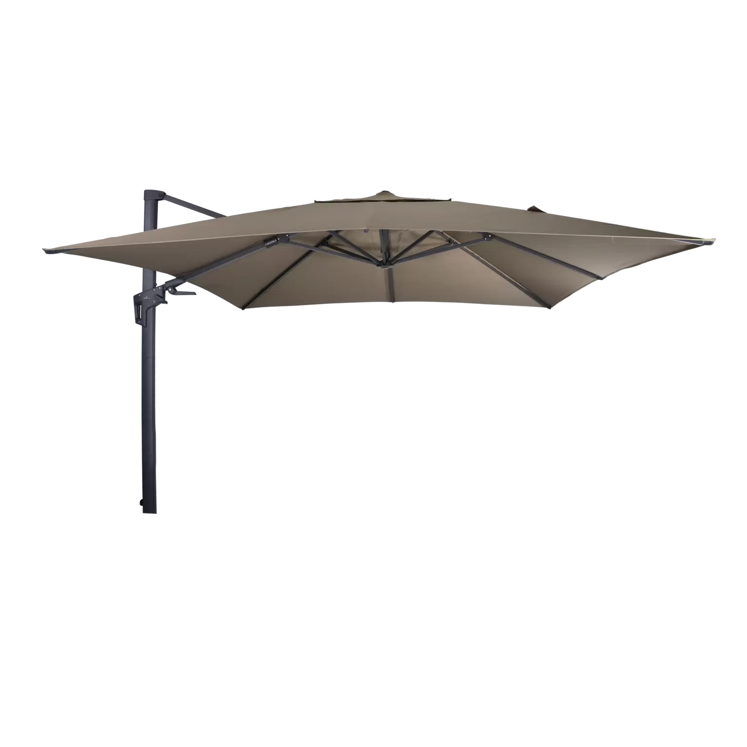 Grote Zweefparasol VirgoFlex Taupe 3x3m van Lesli Living. Een grote luxe inklapbare parasol zonder parasolvoet en zonder parasolhoes voor schaduw op het balkon of in de tuin.