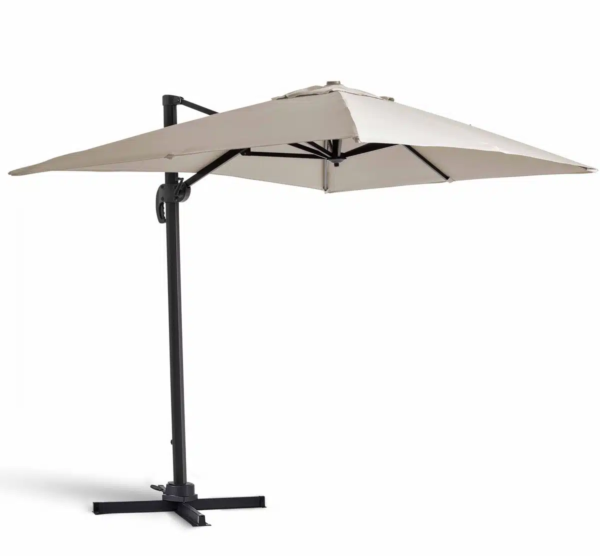 De parasol heeft een stevige aluminium mast die licht van gewicht en tegelijk robuust is. Het ongebleekte doek is speciaal behandeld om verkleuring door zonlicht te verminderen en behoudt daardoor langer zijn frisse look. Door het slimme draaimechanisme kan de parasol soepel over 360 graden roteren zodat de schaduw altijd volgt waar jij dat wilt.