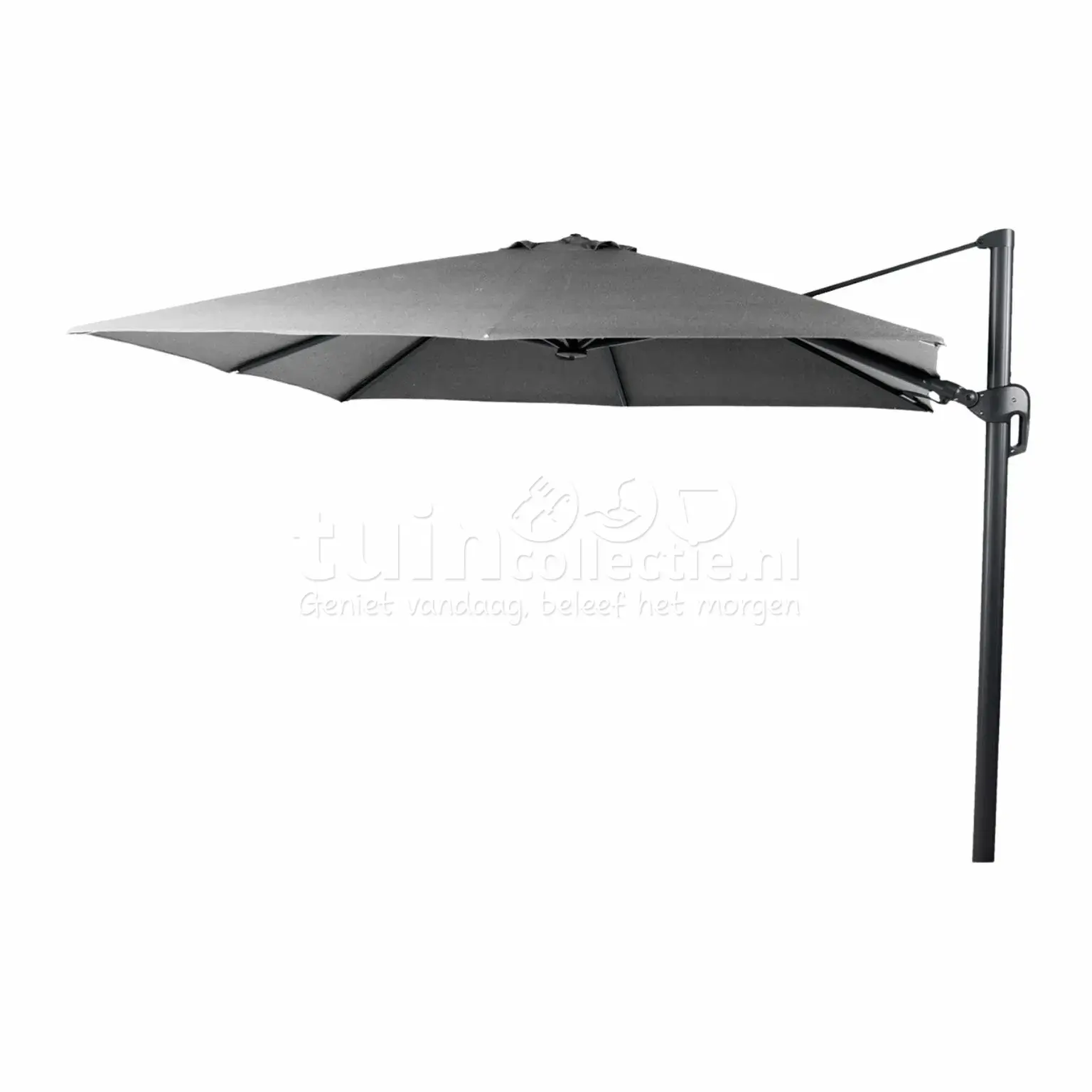 Deze zweefparasol combineert ruimtelijke schaduw met een strak en tijdloos uiterlijk. Met een oppervlak van drie bij drie meter creรซert het zonnedek voldoende beschutting voor loungesets en grote eettafels. De lichtgrijze kleur voegt een rustige en moderne toets toe aan elke buitenruimte.