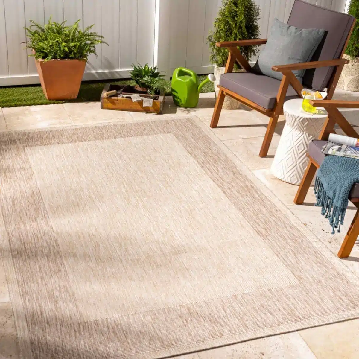 Transformeer uw buitenruimte met ons schitterende, multifunctionele vloerkleed. Dit elegante en verfijnde tuinkleed is perfect voor uw terras, balkon, veranda of zelfs in ruimtes met veel verkeer binnenshuis. Het moderne geometrische patroon combineert Scandinavische, Boheemse chic en Oosterse invloeden, waardoor het een stijlvolle aanvulling is op elke inrichting. Ontworpen voor optimaal buitengebruik, is dit tapijt machinaal geweven en gecertificeerd volgens Oeko-Tex Standard 100. Het is duurzaam, bestand tegen vocht en schimmel, en kleurecht, zodat het jarenlang mooi blijft onder de pergola, bij de tuinmeubelen of onder de hangmat. Het laagpolige ontwerp is zowel stevig als comfortabel. Dit vloerkleed past uitstekend bij diverse materialen zoals hout, aluminium of polyrotan. Het is eenvoudig in onderhoud: regelmatig stofzuigen en kleine vlekken deppen met een mild reinigingsmiddel is voldoende. Daarnaast is het bestand tegen kleine ongelukken van kinderen of huisdieren. Haal de gezelligheid van binnen naar buiten of geef uw interieur een warme, gelaagde touch met dit veelzijdige en onderhoudsarme buitenkleed van 160 x 213 cm.
