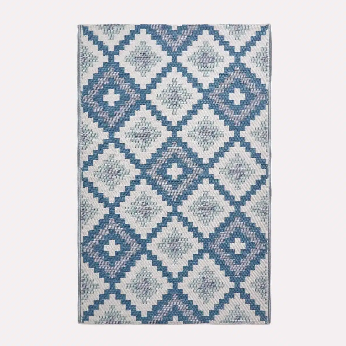 Voeg kleur en stijl toe aan uw buitenruimte met dit decoratieve, omkeerbare tuinkleed (150 x 240 cm). Het tapijt heeft een opvallend blauw geometrisch patroon en is gemaakt van 100% gerecycled polypropyleen, waardoor het een duurzame keuze is. Dit weerbestendige mat is lichtgewicht en waterdicht, ideaal voor elk seizoen. Perfect voor op het balkon, terras, in de tuin, op de camping of zelfs binnenshuis. Het kleed is eenvoudig te reinigen; vuil wegvegen of voorzichtig wassen met milde zeep. Voor gebruik binnenshuis wordt een antislipmat aangeraden. Draai het tapijt regelmatig om gelijkmatige slijtage te garanderen. Een veelzijdig en stijlvol accessoire om elke buitenruimte direct op te fleuren.
