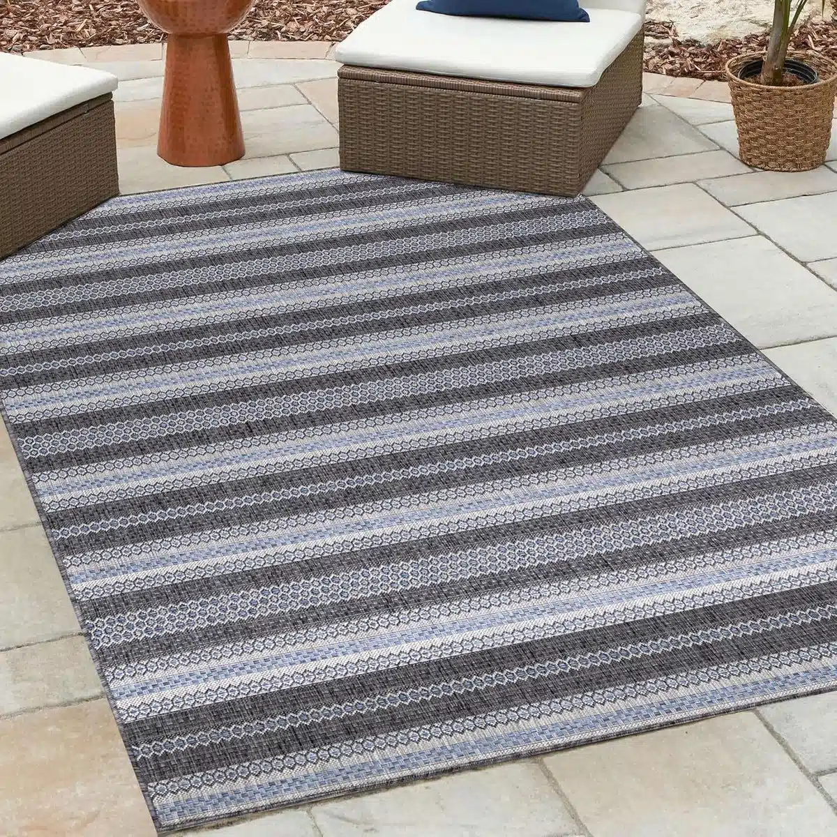 Dit weerbestendige buitentapijt van 120×170 cm combineert praktisch gebruik met een subtiel zwart strepen design. Het neutrale, merkloze uiterlijk past moeiteloos bij verschillende buitenstijlen. Door het compacte formaat is het geschikt voor terrassen, balkons en kleine tuinen. De uitstraling blijft strak en modern.