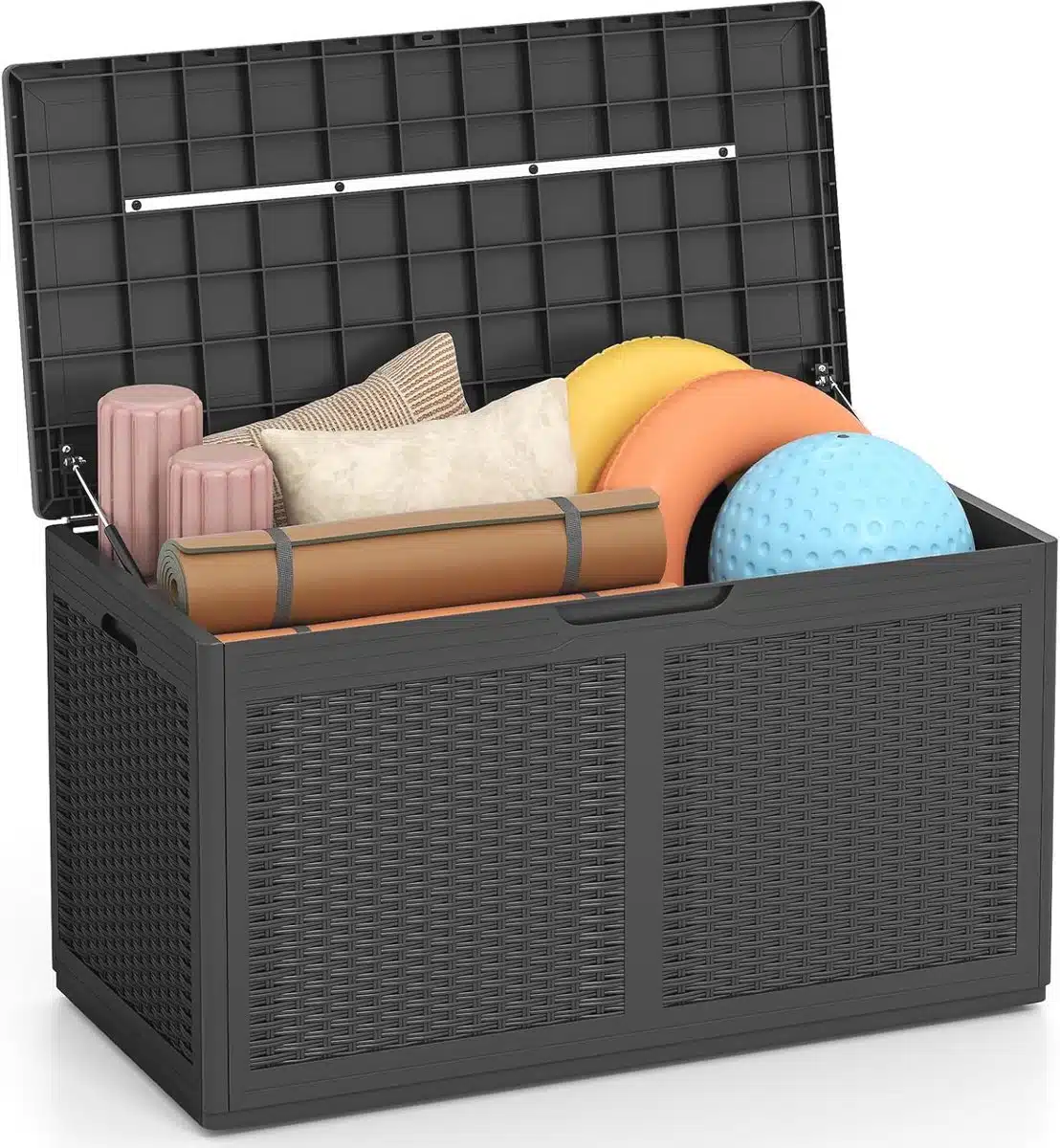 Binnenin is er ruimte voor seizoensgebonden spullen, tuingereedschap en speelgoed. De grote inhoud zorgt dat je meerdere accessoires samen bewaart en snel terugvindt. Door het compacte en strakke ontwerp past de box bij verschillende tuinstijlen, van modern tot klassiek, zonder veel ruimte in te nemen.