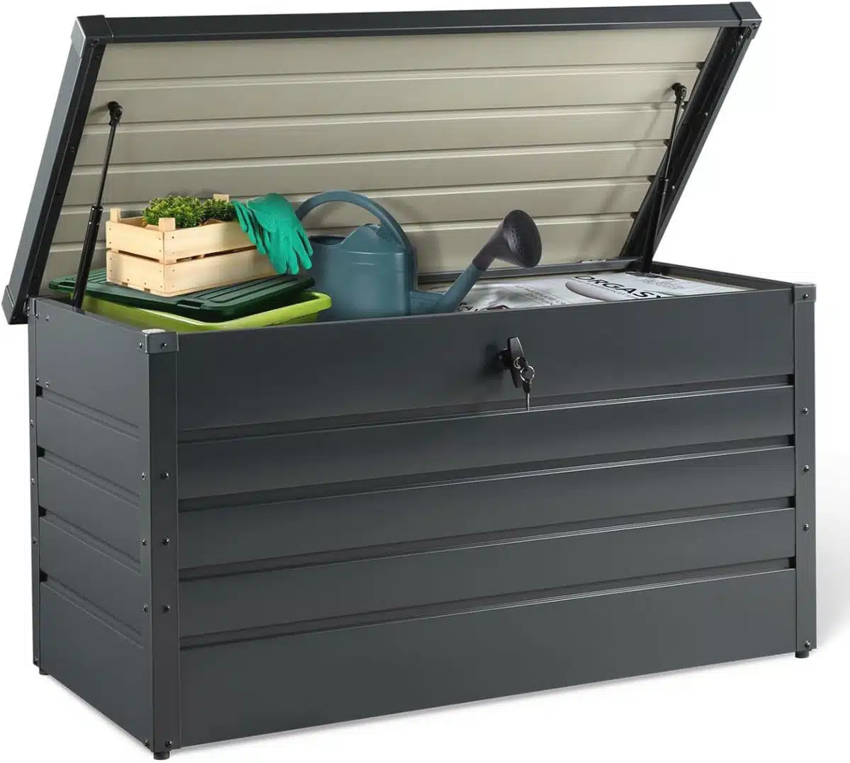 Deze afsluitbare metalen opbergdoos van 350 liter in antracietgrijs biedt een stijlvolle en veilige oplossing voor buiten. Het ruime interieur is ideaal voor tuinkussens gereedschap en seizoensspullen. Het robuuste materiaal en de slijtvaste afwerking beschermen tegen regen wind en vuil. Dankzij het eenvoudige slot blijft alles goed afgesloten en beschermd tegen onbevoegden.