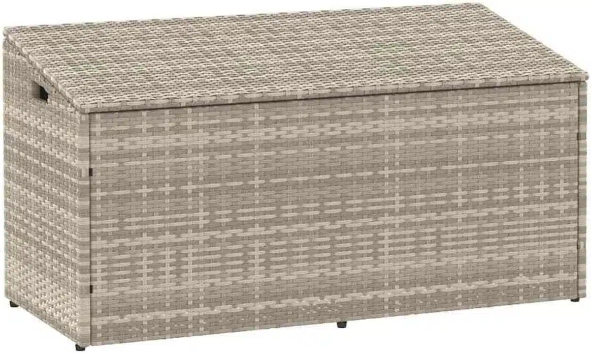 Ruimtebesparende en stijlvolle opbergbox voor buiten is ontworpen om tuinkussens en accessoires netjes te bewaren. Met afmetingen 110x50x58 cm biedt deze box een slimme combinatie van compactheid en capaciteit, ideaal voor wie zoekt naar ordening zonder concessies aan uitstraling. Het lichtgrijze poly rattan weeft een moderne en rustige sfeer in elke buitenomgeving.