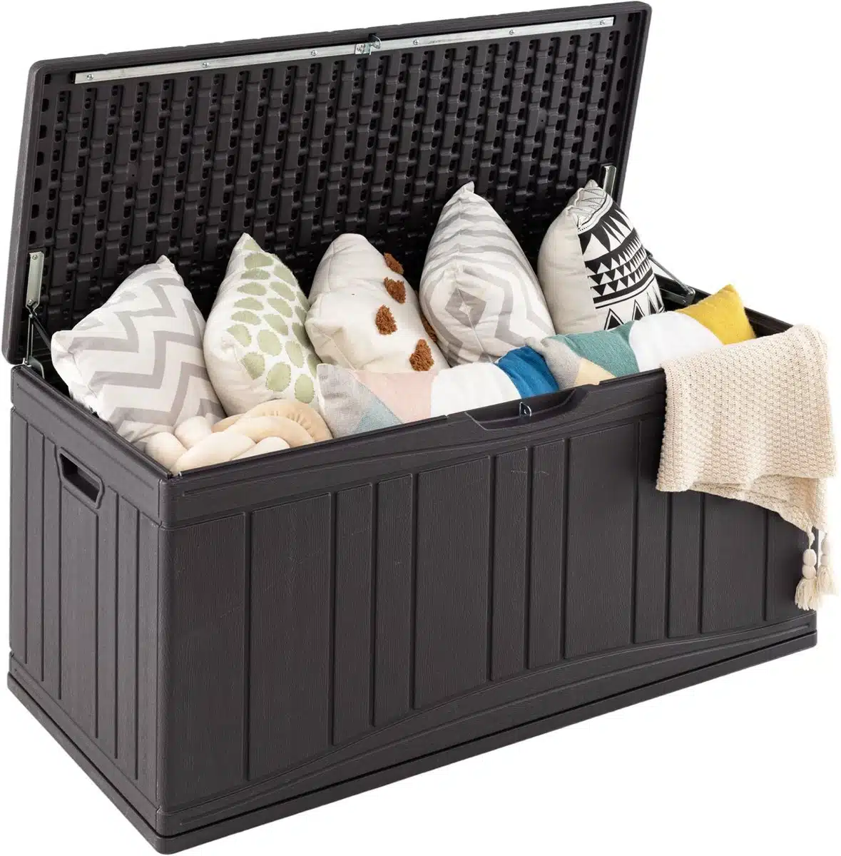 COSTWAY Tuinbox 300 liter combineert ruime opbergruimte met een doordacht ontwerp voor buiten. Deze bruine opbergbox biedt plek aan kussens tuinmateriaal en gereedschap zodat spullen netjes opgeborgen blijven. Het afsluitbare deksel is uitgerust met gasdrukveren die het deksel soepel laten openen en veilig openhouden tijdens in- en uitladen.
