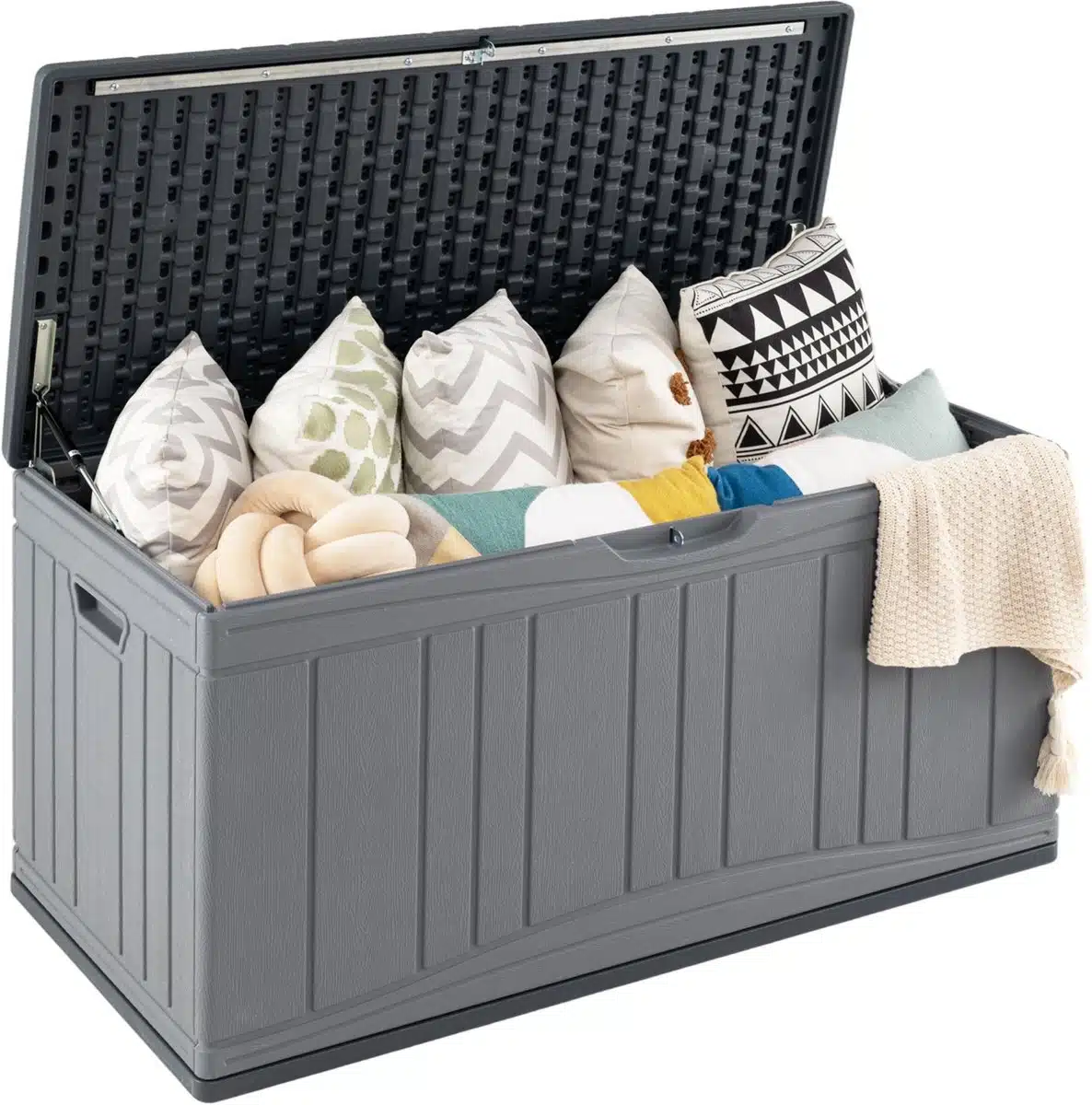 Het materiaal is speciaal behandeld om bestand te zijn tegen regen en zon, waardoor deze tuinbox onderhoudsarm is en lang meegaat. Een vochtwerende constructie zorgt ervoor dat kussens en andere zachte materialen droog en fris blijven. Het grijze uiterlijk is tijdloos en past gemakkelijk bij verschillende tuininrichtingen.