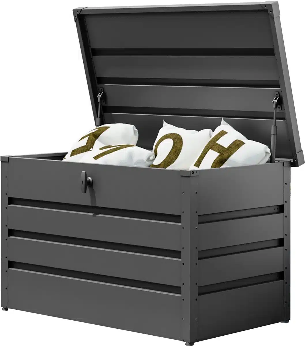 Handige GFP Primeyard tuinbox 102x61x61 cm, biedt genoeg ruimte voor kussens en tuingereedschap. Degelijke metalen uitvoering in antraciet, staat stabiel buiten en houdt spullen goed droog bij slecht weer. Makkelijk te plaatsen en praktisch in gebruik.