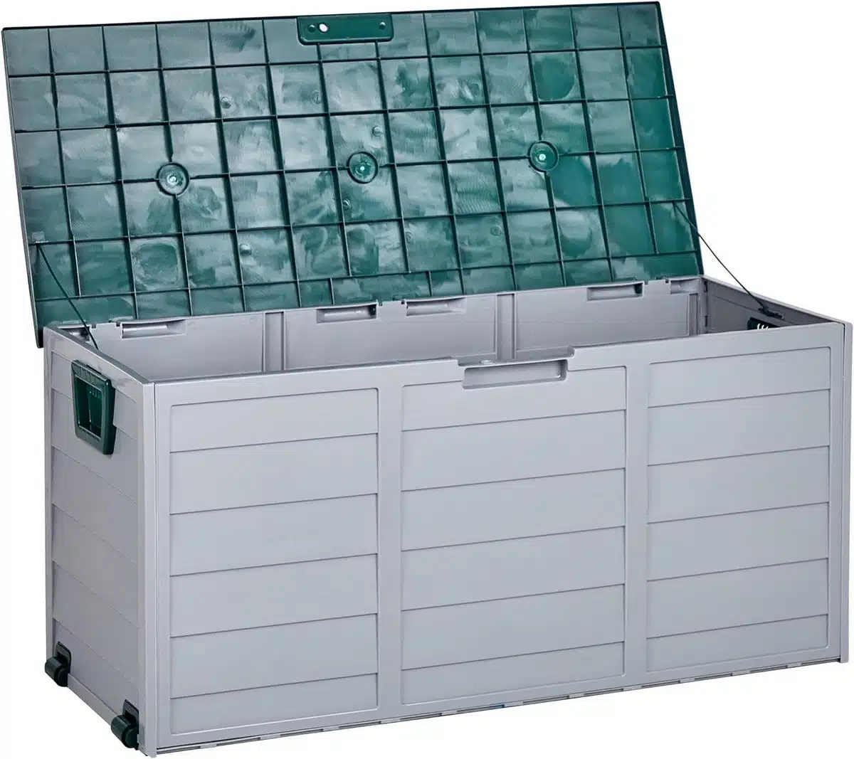 De kist is waterdicht en beschermt inhoud tegen regen en weersinvloeden. Met voldoende ruimte berg je kussens gereedschap tuinkussens en accessoires netjes op. Wielen en een handgreep maken het verplaatsen gemakkelijk zodat je de opbergruimte flexibel inzet.