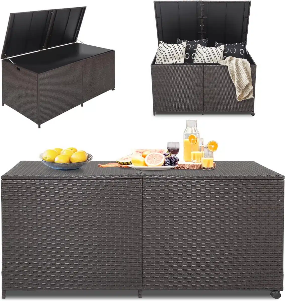 Met dit model kies je voor praktische functionaliteit en een natuurlijke uitstraling. Het is een eenvoudige oplossing om tuinkussens, kleine gereedschappen en seizoensspullen netjes opgeborgen te houden. Ideaal voor wie ruimte wil besparen en tegelijk wil zorgen dat buitentextiel goed beschermd blijft tegen regen en vuil.