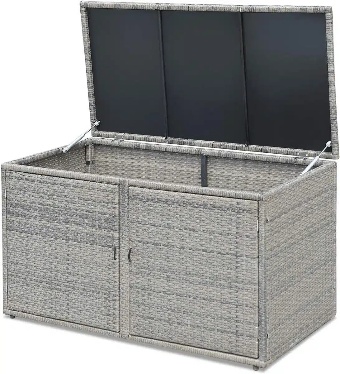 Het kleurenschema in bruin en zwart geeft de opbergbox een natuurlijke en moderne uitstraling. De gevlochten look van het wicker geeft textuur zonder te overheersen. Dankzij de compacte vorm neemt de box weinig vloeroppervlak in beslag en is hij ideaal voor kleine terrassen, balkons en grotere buitenruimtes.