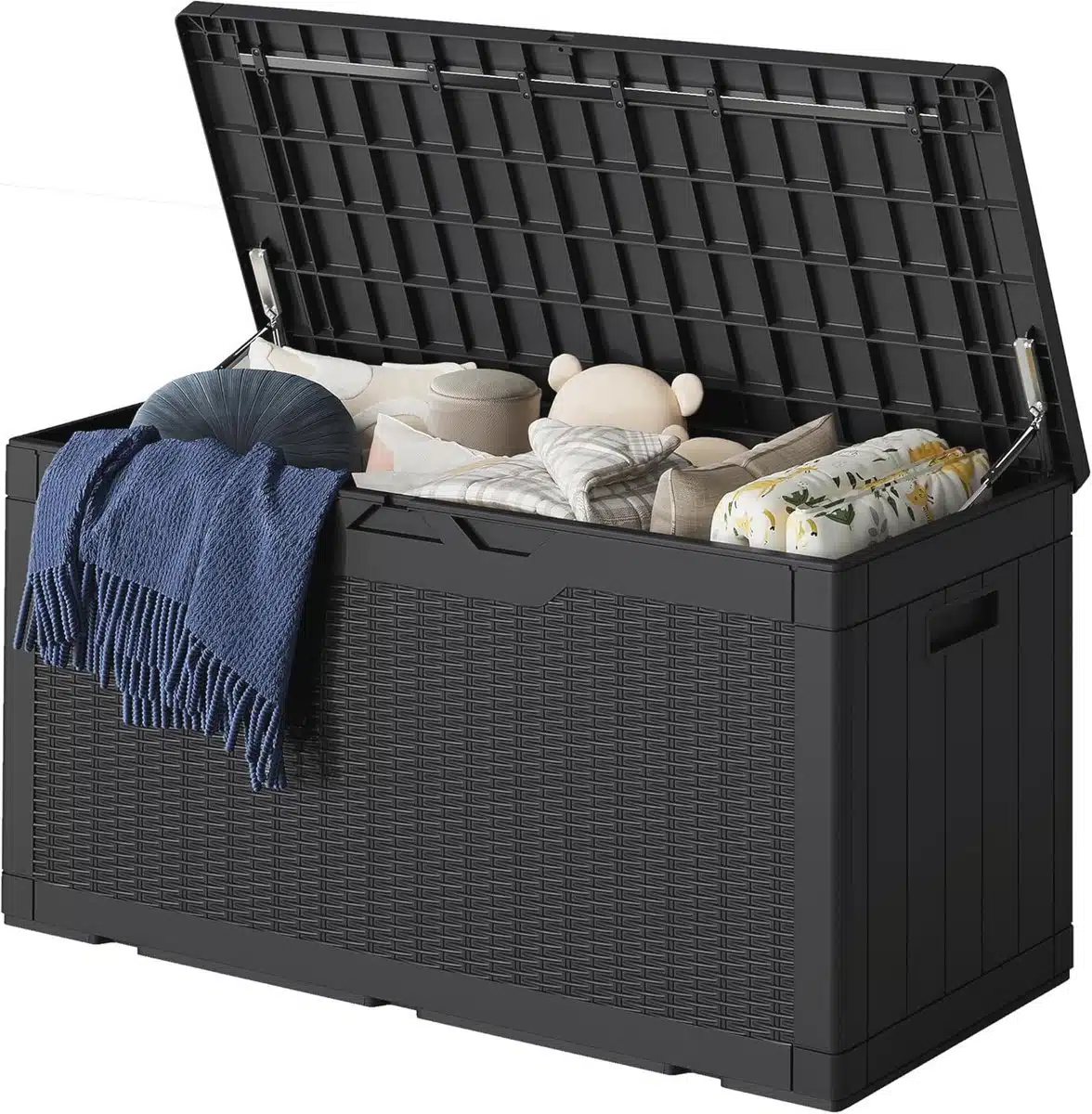 Deze opslagbox is ideaal voor meerdere toepassingen. Gebruik hem voor tuinmeubelkussens zwembadaccessoires gereedschapssetten en kinderspeelgoed. De neutrale zwarte kleur en merkloze uitstraling maken de box geschikt voor een groot scala aan buitenomgevingen. Of u nu een compacte patio of een ruime tuin heeft, de box biedt praktische ordening en bescherming.