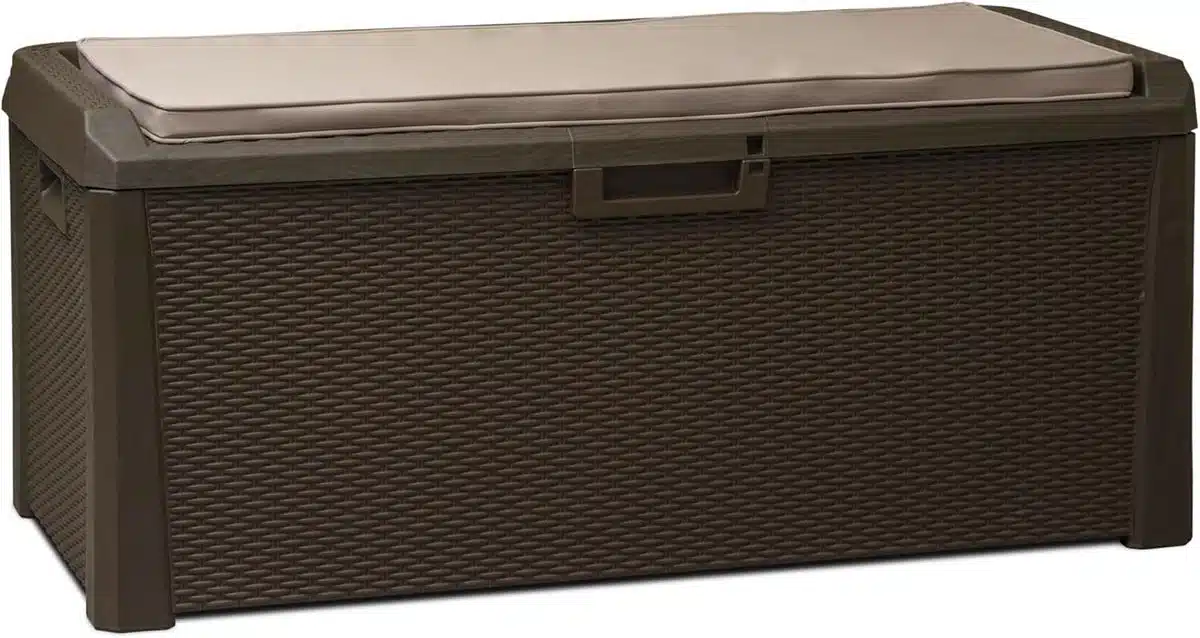 Deze ruime bruine tuinkist zonder merk is ontworpen voor slim buitenopbergen en extra zitcomfort. Het model combineert een royaal interieur met een zacht kussen op het deksel, zodat je naast opslag ook een extra zitplek hebt. De neutrale kleur past bij veel tuinstijlen en geeft een rustige uitstraling.
